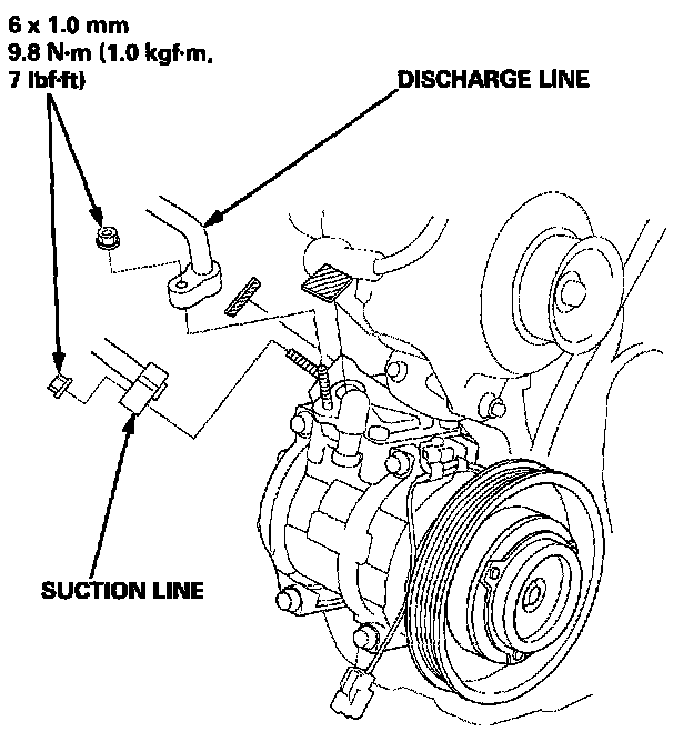 6. Remove the nuts then disconnect the suction and discharge lines from the compressor.