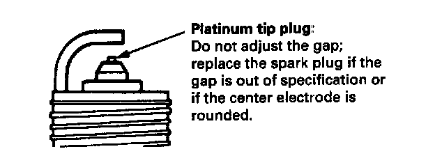 2. Do not adjust the gap of platinum tip plugs; replace the spark plug if the gap is out of specification or if the center electrode is rounded.