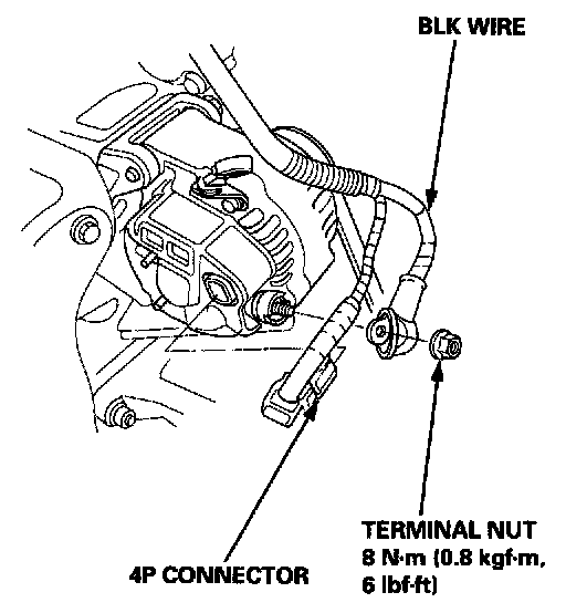 3. Disconnect the 4P connector and BLK wire from the alternator.
