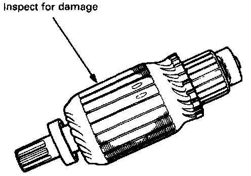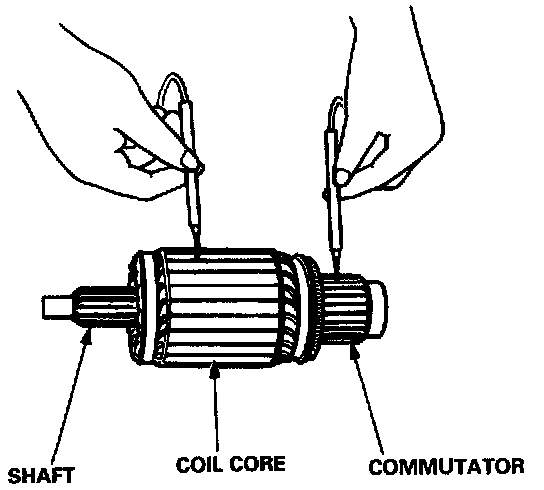 7. Check with an ohmmeter that no continuity exists between the commutator and armature coil core, and between the commutator and armature shaft. If continuity exists, replace the armature.