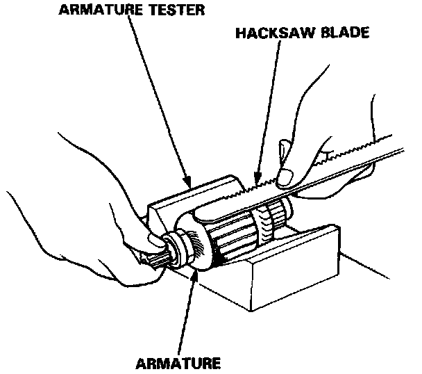 6. Place the armature on an armature tester. Hold a hacksaw blade on the armature core.