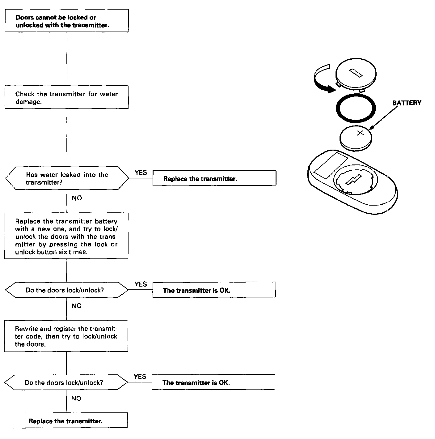 ^ If the doors unlock or lock with the transmitter, but the LED on the transmitter does not come on, the LED is faulty; replace the transmitter.
