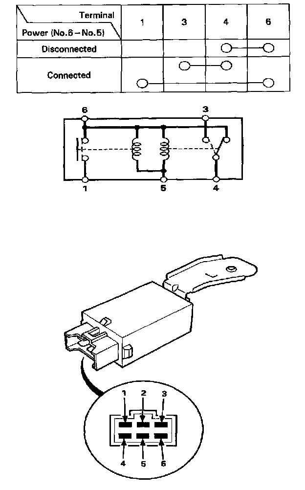 ^ There should be continuity between No.1 and No.6 terminals, and the No.3 and No.4 terminals when power and ground are connected to the No.6 and No.5 terminals.