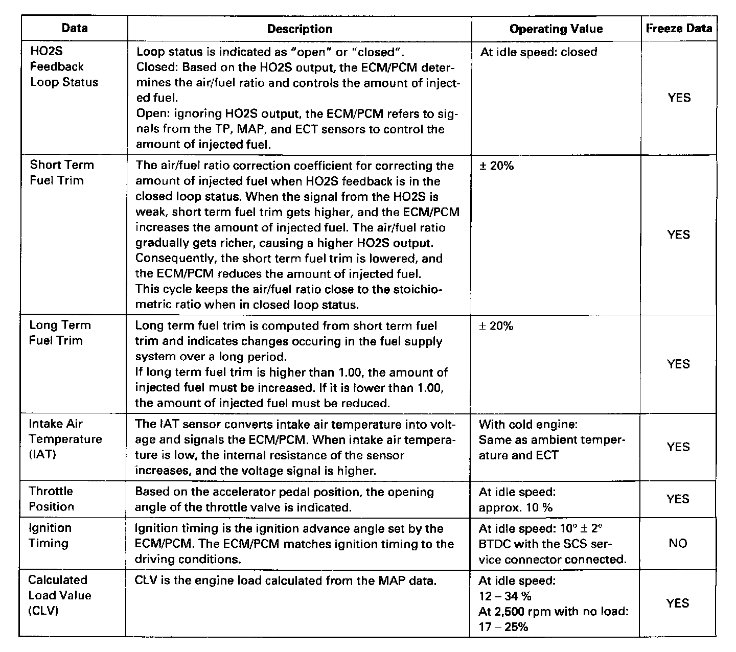 ECM/PCM DataBy connecting the OBD-II scan tool or the Honda PGM Tester to the 16P data link connector (DLC), various data can be retrieved from the ECM/PCM. The items listed in the table below conform to the SAE recommended practice.