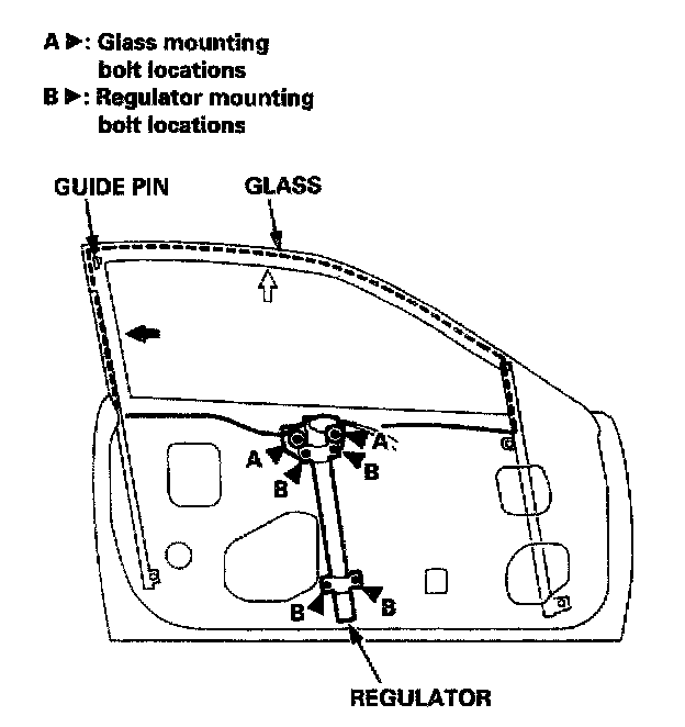 4. Loosen the glass mounting bolts and regulator mounting bolts.