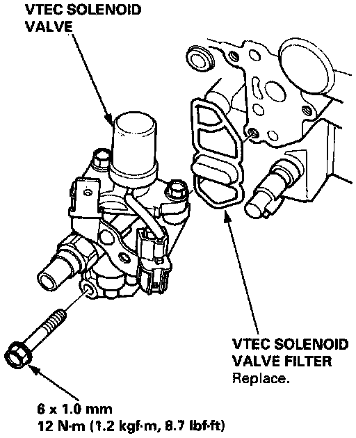3. If the resistance is within specifications, remove the VTEC solenoid valve from the cylinder head, and check the VTEC solenoid valve filter for clogging.