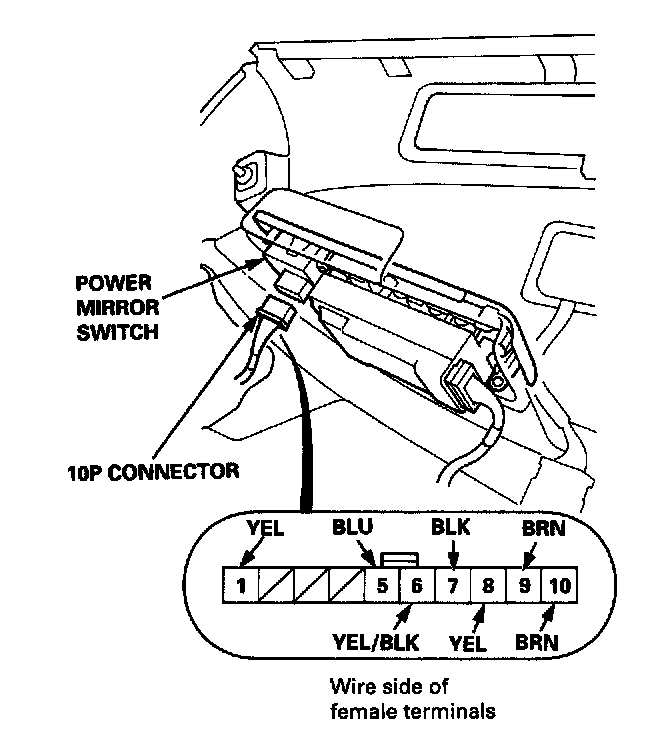 - an open in the BLU (or YEL) wire between the right mirror and the 10P connector.