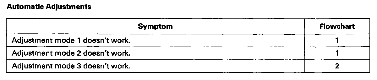 Troubleshooting GuideAfter completing the pre-troubleshooting tests, select the flowchart(s) for the symptom(s) you want to troubleshoot. If the symptom(s) are related to automatic adjusting, first read the explanation for the automatic adjustment modes.