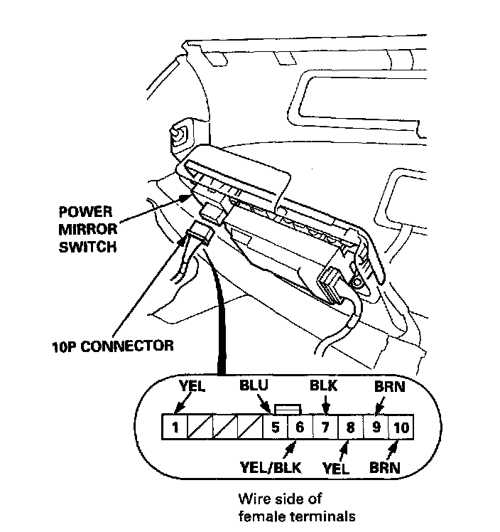 - an open in the BLU (or YEL) wire between the right mirror and the 10P connector.
