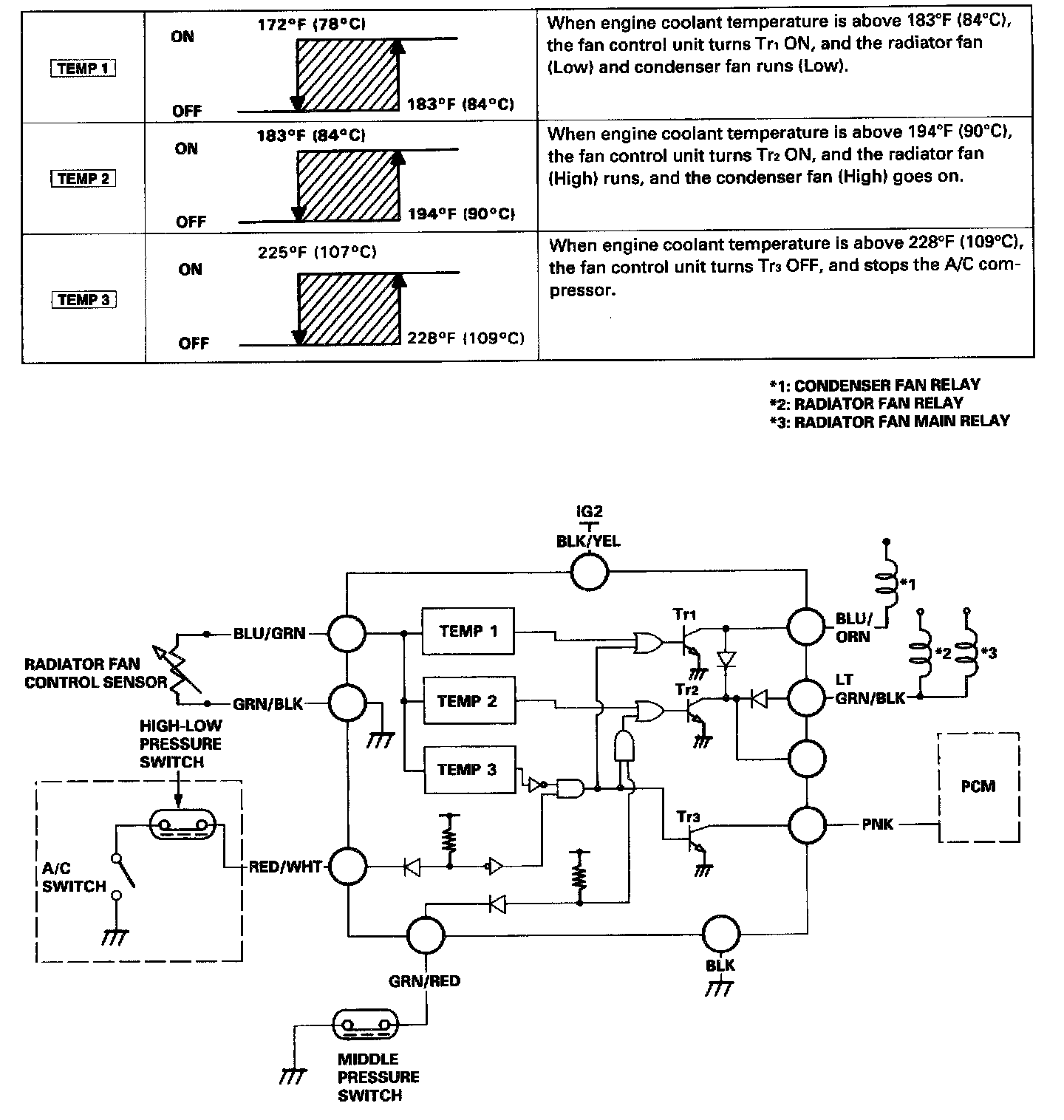 The fan control unit makes calculations based on signals from the radiator fan control sensor. It then controls the operation of the radiator fan, condenser fan and A/C system.