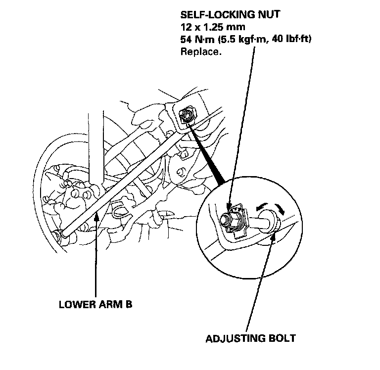 2. Hold the adjusting bolt on the rear lower arm B and, loosen the self-locking nut.