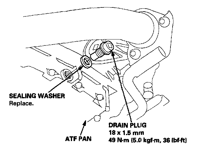 1. Bring the transmission up to normal operating temperature (the radiator fan comes on) by driving the vehicle. Park the vehicle on level ground, turn the engine off, and remove drain plug.