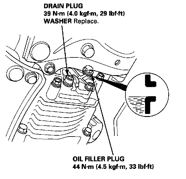 2. The oil level must be up to the fill hole. If it is below the hole, add oil until it runs out, then reinstall the oil filler plug with a new washer.