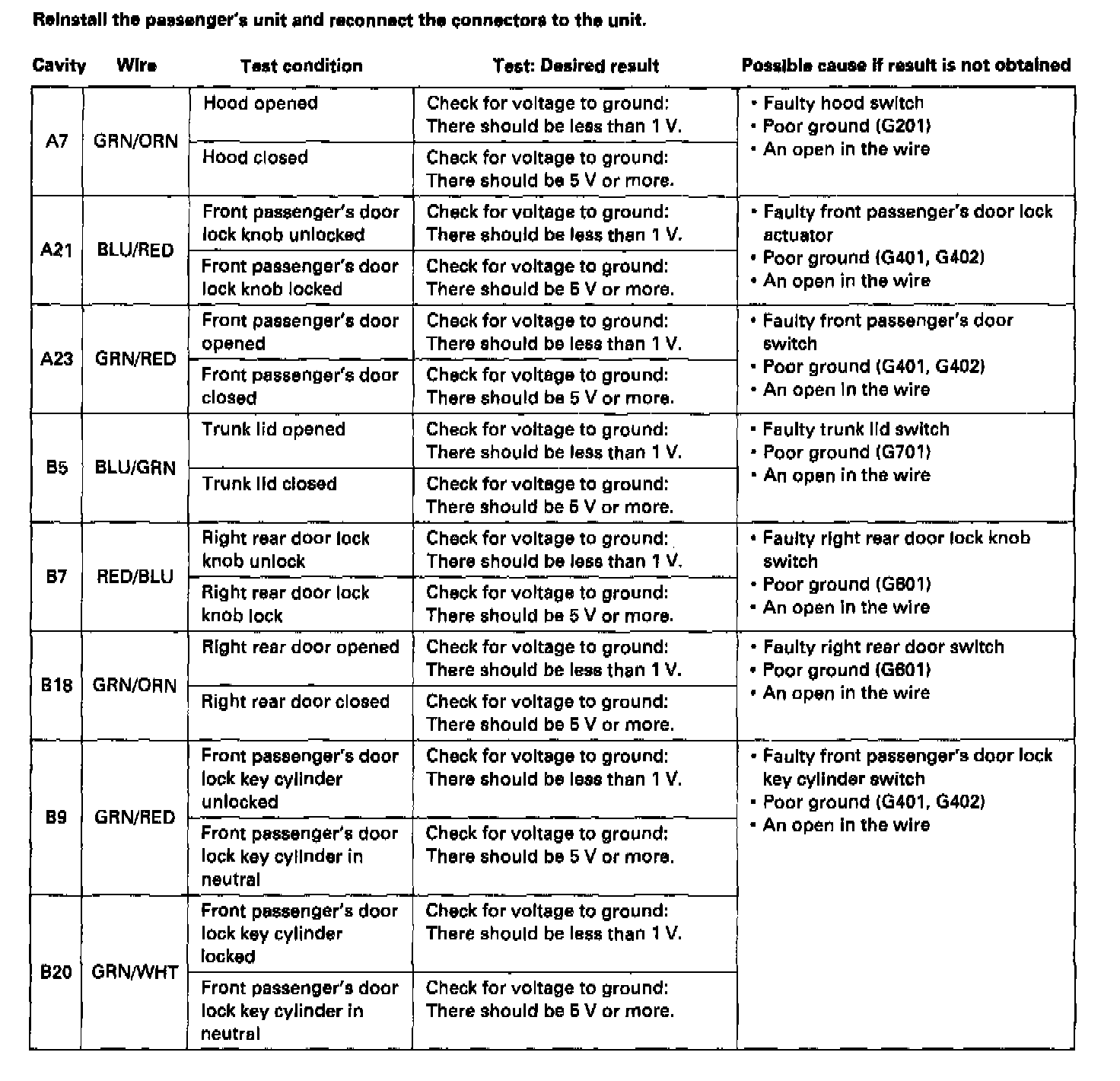 If any test indicates a problem, find and correct the cause, then recheck the system. If all the input tests prove OK, the control unit must be faulty; replace it.