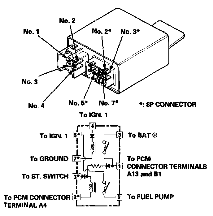 2. Attach the battery positive terminal to the No.3* terminal and the battery negative terminal to the No.2* terminal of the PGM-FI main relay. Then check for continuity between the No.5* terminal and No.2 terminal of the PGM-FI main relay.