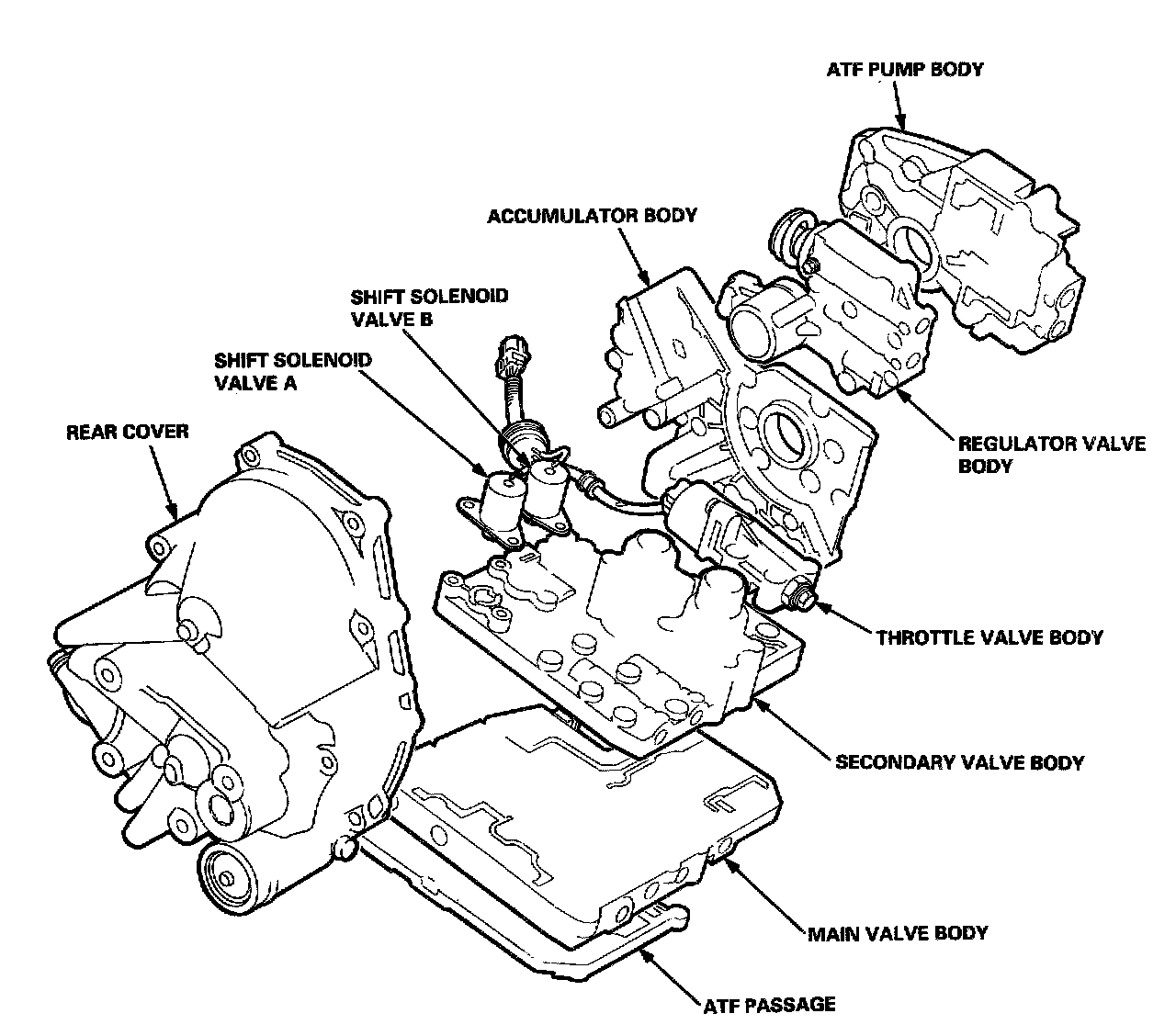 The shift solenoid valves A and B are bolted on the secondary valve body. The torque converter clutch (lock-up control) solenoid valves A and B are bolted on the outside of the torque converter housing.