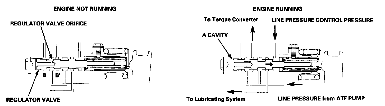 The fluid from the ATF pump flows through B and B '. The fluid entering from B flows through the regulator valve orifice to the A cavity. This pressure of the A cavity pushes the regulator valve to the right side. The line pressure control pressure flows to the right side of the regulator valve, and pushes the regulator valve to the left side. As a result, the regulator valve stays at a certain position, and maintains it to regulate line pressure. The line pressure control pressure increases according to the throttle opening (throttle B pressure), while the line pressure increases according to the line pressure control pressure. The line pressure can be regulated a wide range by the line pressure control pressure.