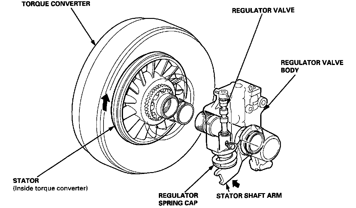 Hydraulic pressure increases according to the torque is performed by the regulator valve using the stator torque reaction. The stator shaft is splined with the stator in the torque converter, and its arm end contacts the regulator spring cap. When the vehicle is accelerating or climbing (Torque Converter Range), the stator torque reaction acts on the stator shaft, and the stator arm pushes the regulator spring cap in the direction of the arrow in proportion to the reaction. The stator reaction spring compresses, and the regulator valve moves to increase the line pressure which is regulated by the regulator valve. The line pressure reaches its maximum when the stator torque reaction reaches its maximum.
