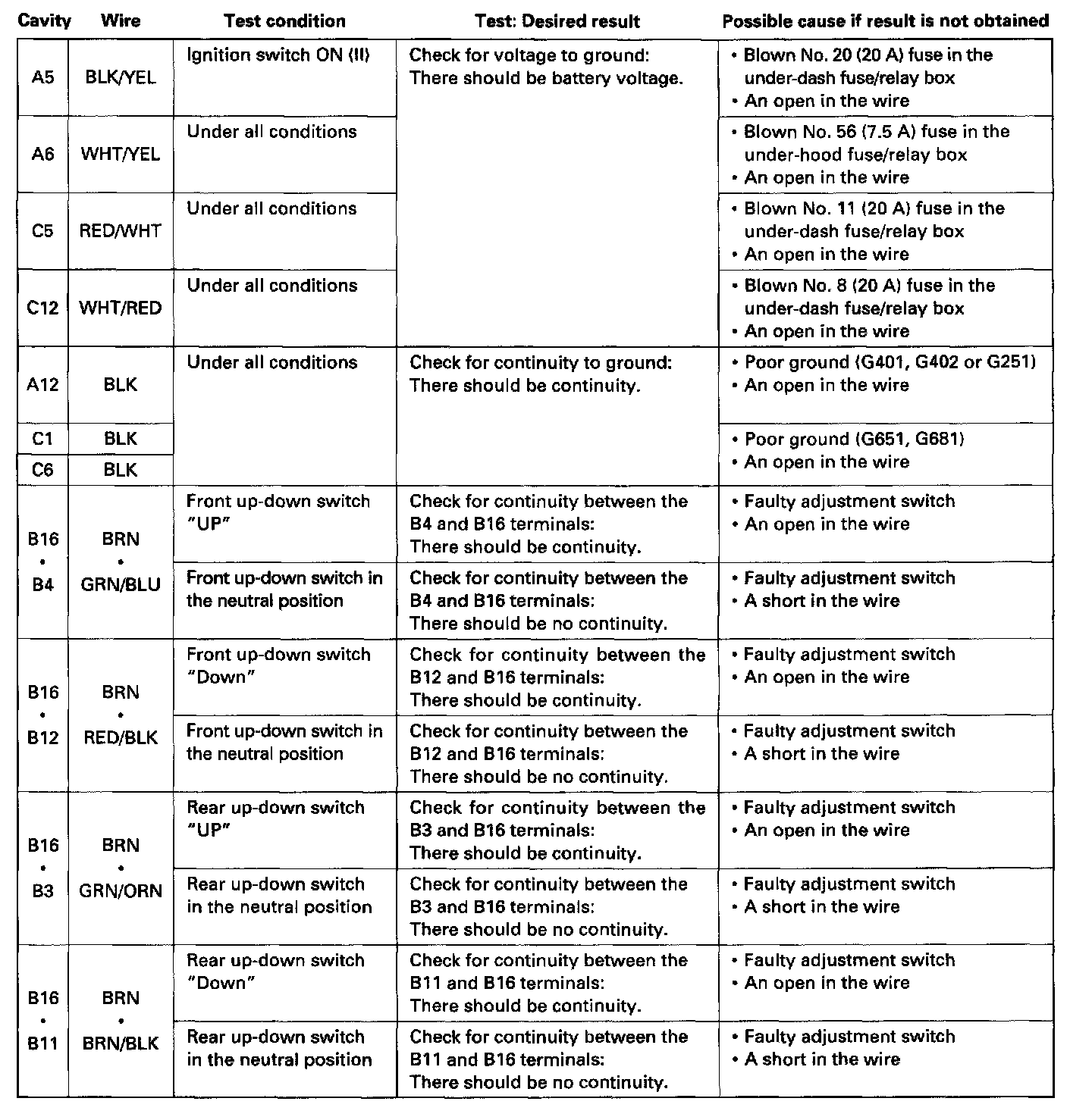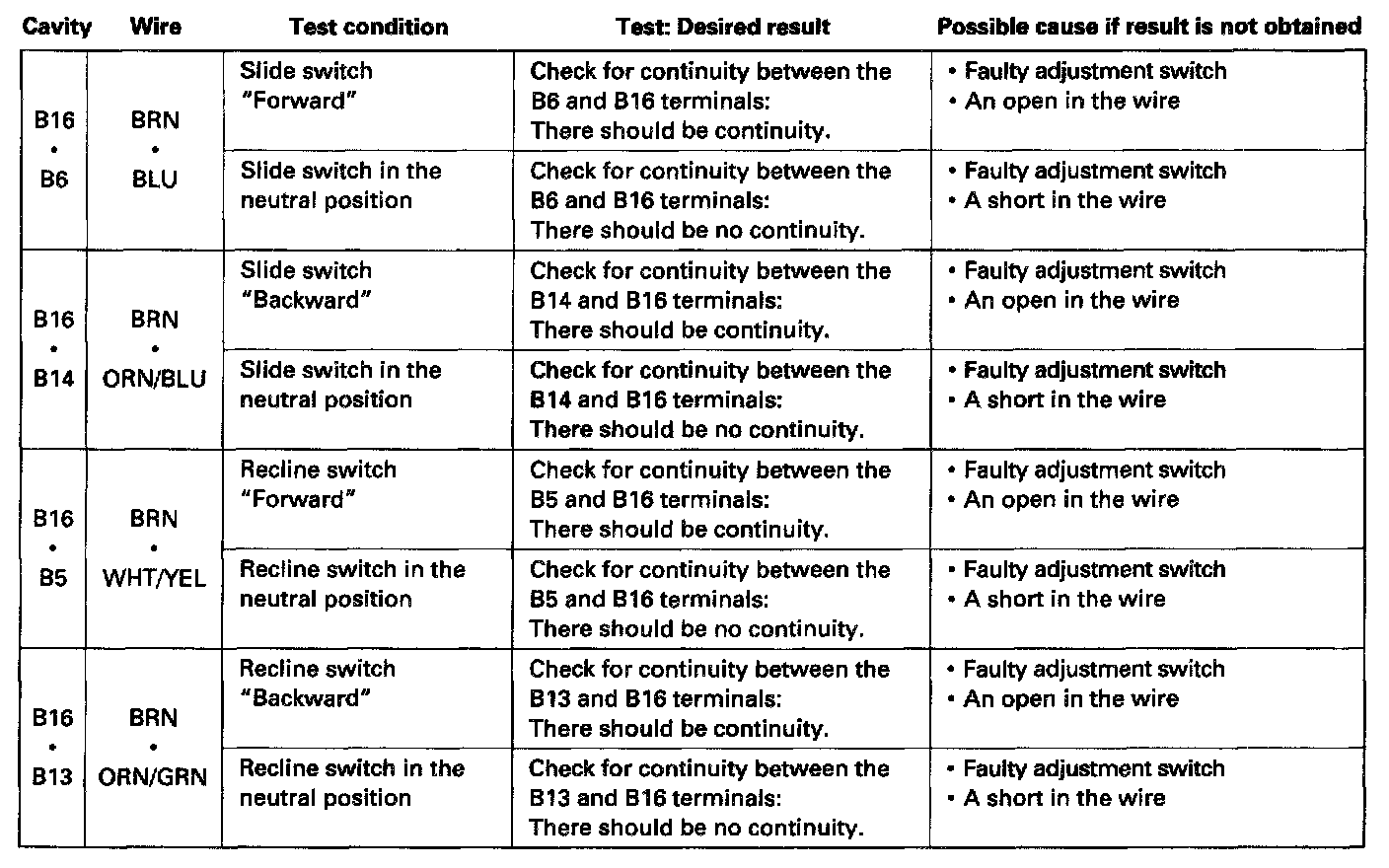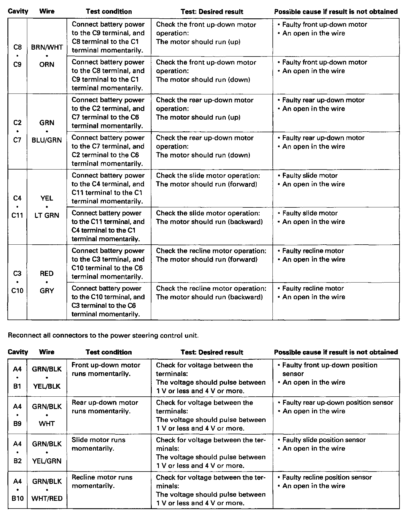 - If all the control unit (steering column, power seat, power mirror) input tests prove OK, disconnect all three control units, and check for opens or shorts in the communication lines.