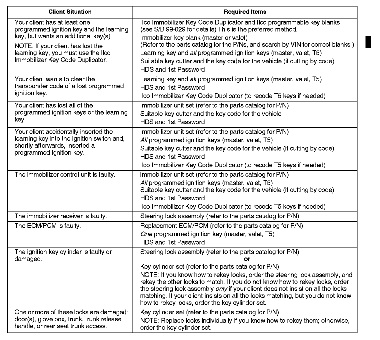 This chart lists the client situations most commonly associated with the immobilizer system, along with the items needed to remedy each situation. If you need to repair the system, refer to the Body Electrical section of the appropriate service manual. If you need the HDS, make sure it is loaded with the latest software and that the setup for it is correct before you use it. If you are adding programmed ignition keys, clearing the transponder codes of lost programmed ignition keys, or replacing the immobilizer control unit, make sure you get all of your client's programmed ignition keys (master, valet, and 15 keys), the learning key, and the key code for the vehicle (if available).