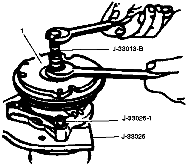 Removal1. Clamp the holding fixture J-33026 in a vise and attach compressor to holding fixture with thumb screws J-33026-1.