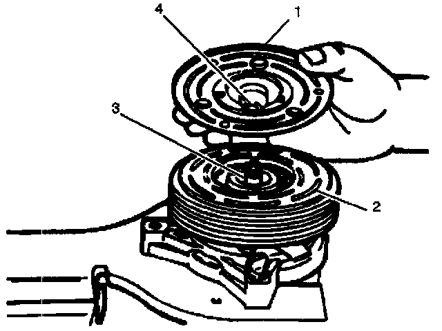 3. Align the shaft key (4) with the shaft keyway (3) and place the clutch plate and the hub assembly onto the compressor shaft.