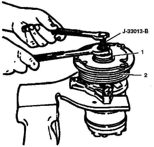 2. With center screw forcing tip in place to thrust against the end of the shaft, thread the Clutch Plate and Hub Assembly Installer-Remover J-33013-B into the hub. Hold the body of the remover with a wrench and turn the center screw into the remover body to remove the clutch plate and hub assembly (1).