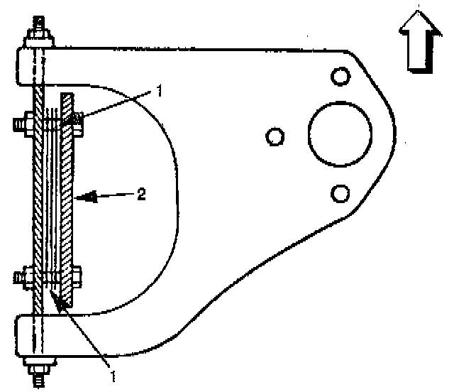The caster angle can be adjusted by means of the caster shims (1) installed between the chassis frame (2) and fulcrum pins.