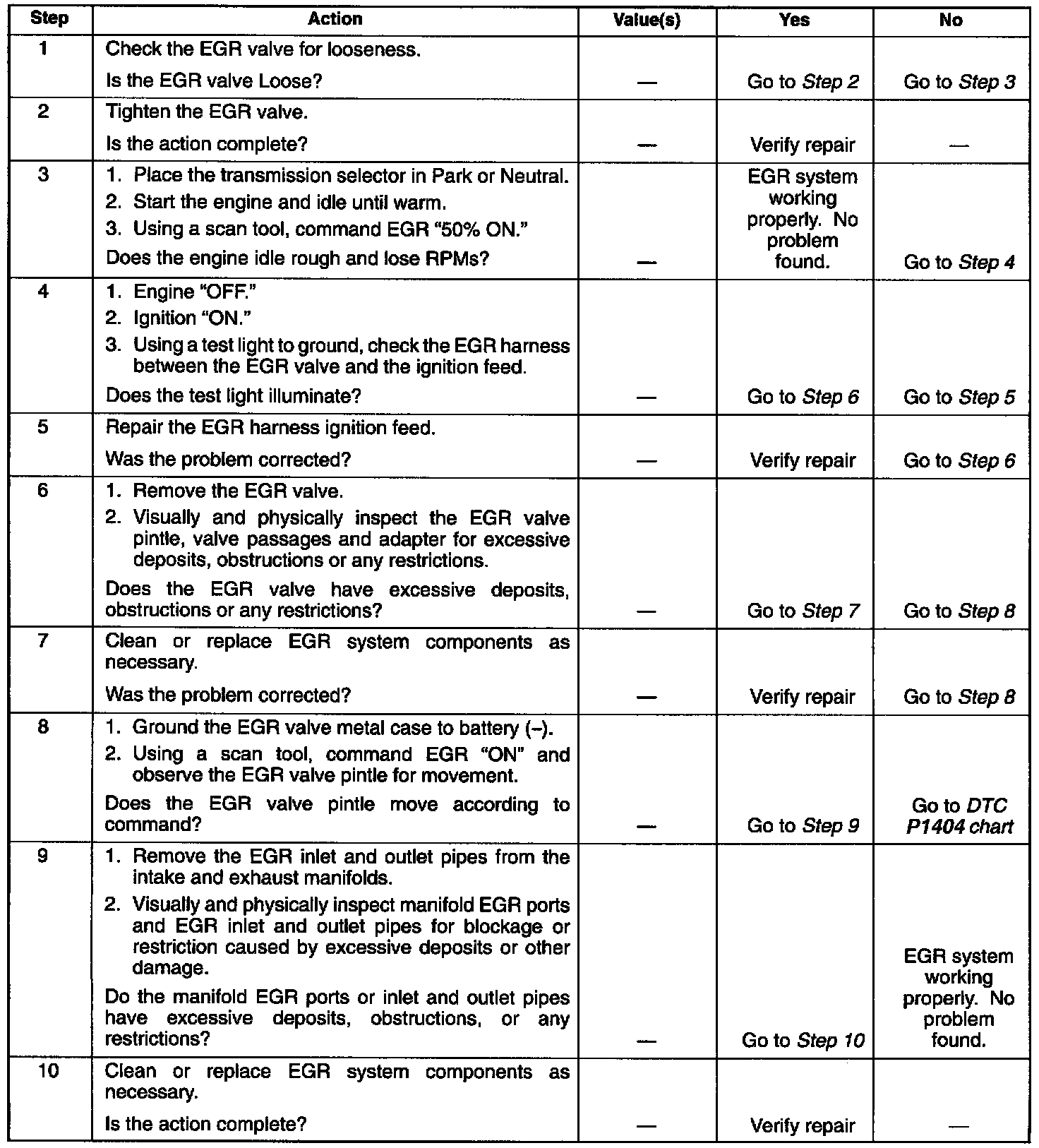 The EGR valve chart is a check of the EGR system. An EGR pintle constantly in the closed position could cause detonation and high emissions of NOx. It could also result in high long term fuel trim values in the open throttle cell, but not in the closed throttle cell. An EGR pintle constantly in the open position would cause a rough idle. Also, an EGR mounted incorrectly (rotated 180°) could cause rough idle. Check for the following items: