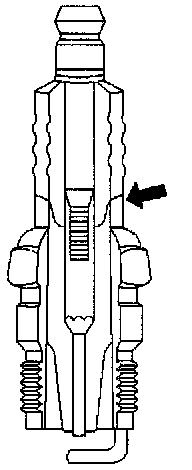 A broken or cracked lower insulator tip (around the center electrode) may result from damage during re-gapping or from "heat shock" (spark plug suddenly operating too hot).