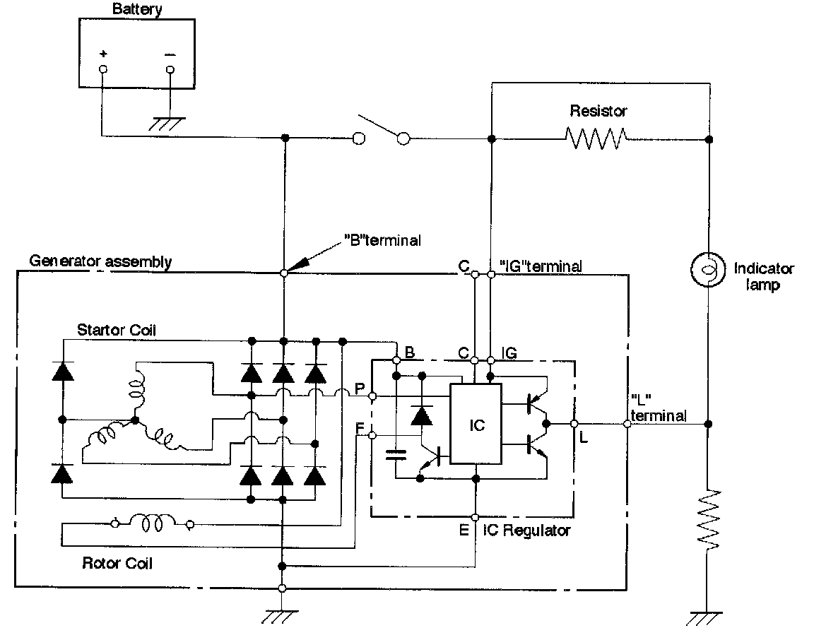 Disconnect wiring connector from generator, and ground the terminal "L" on connector side.