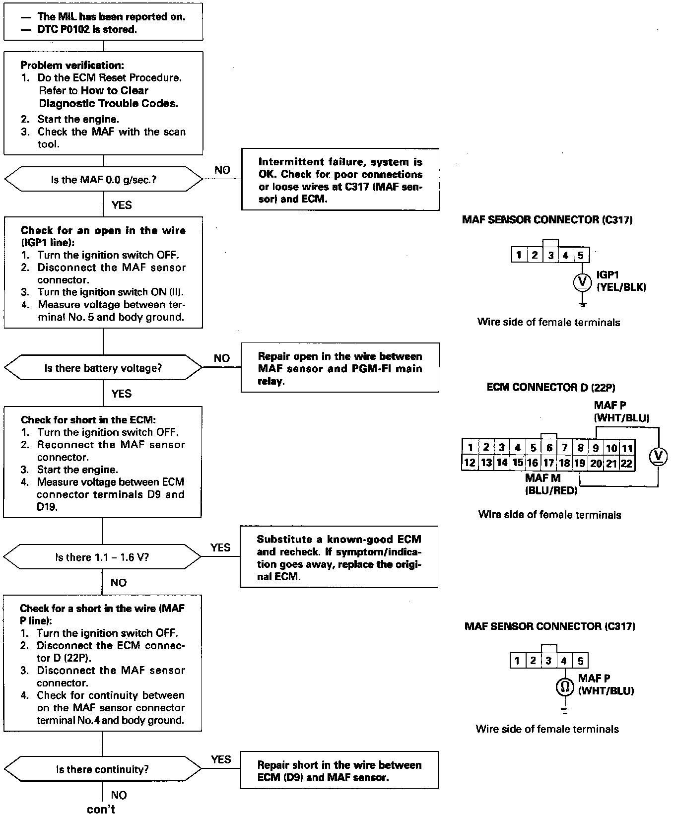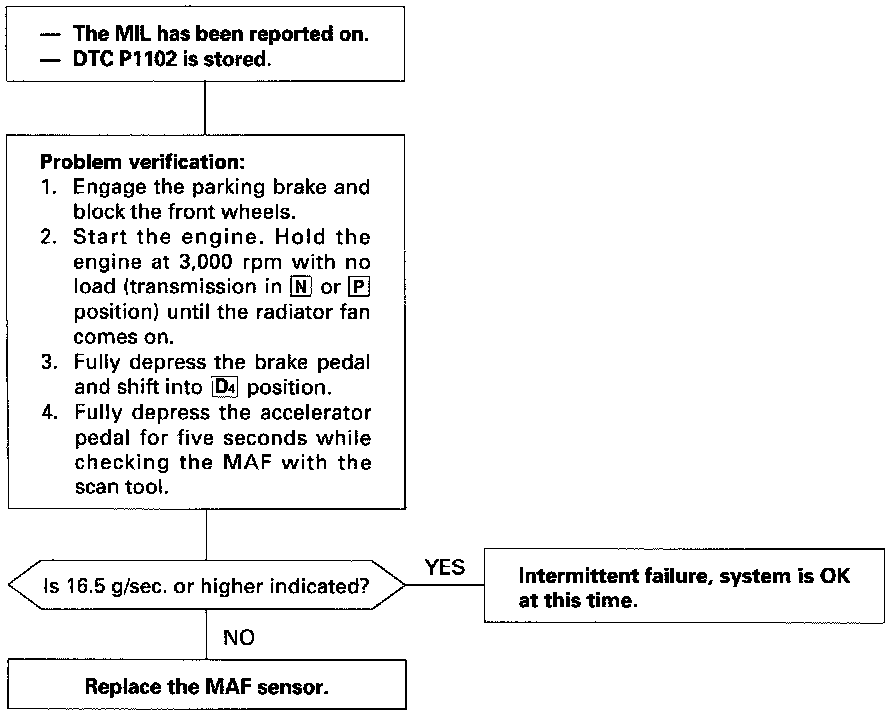 - The scan tool indicates Diagnostic Trouble Code (DTC) P1102: Mass Air Flow (MAF) lower than expected.