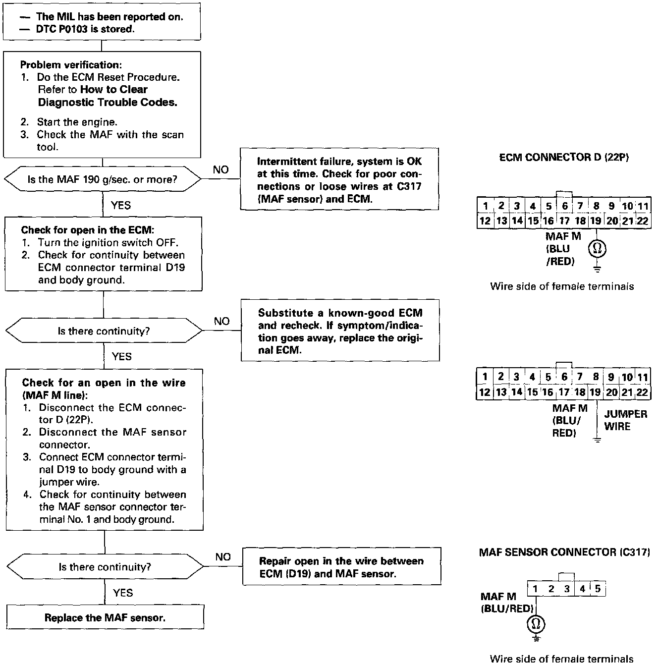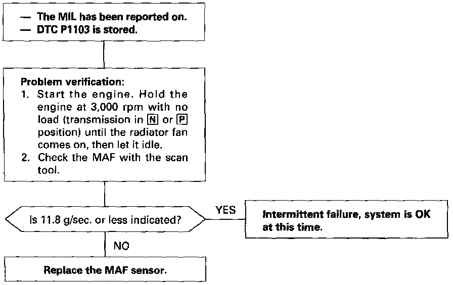- The scan tool indicates Diagnostic Trouble Code (DTC) P1103: Mass Air Flow (MAF) higher than expected.