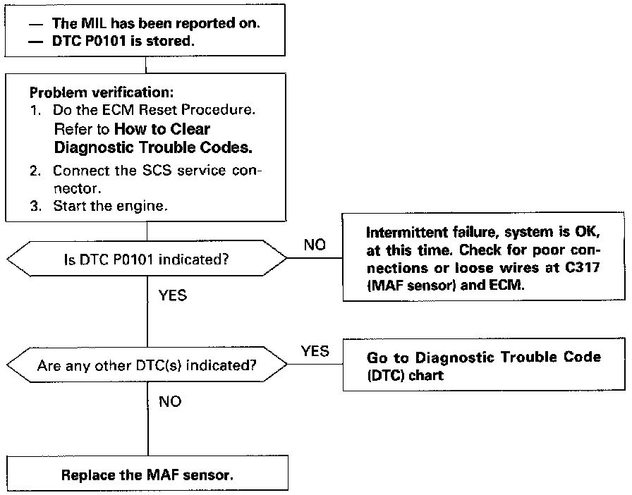 The scan tool indicates Diagnostic Trouble Code (DTC) P0101: range/performance problem in the Mass Air Flow (MAF) Sensor system.