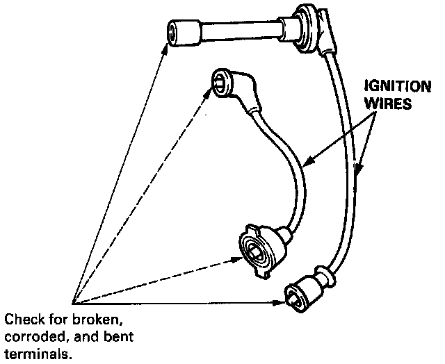 CAUTION: Carefully remove the ignition wires by pulling on the rubber boots. Do not bend the wires; you might break them inside.1. Check the condition of the ignition wire terminals.