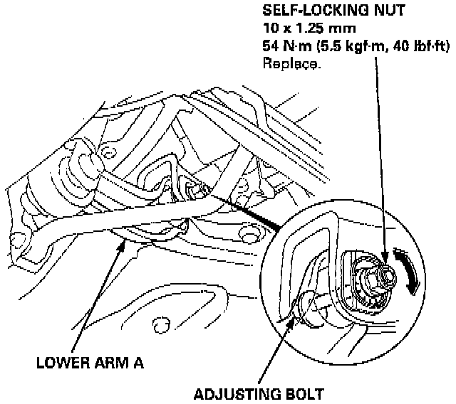 2. Hold the adjusting bolt on the rear lower arm A and loosen the self-locking nut.