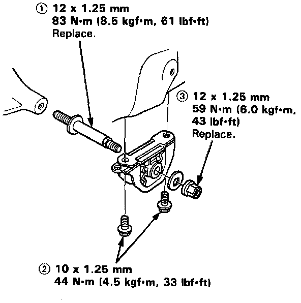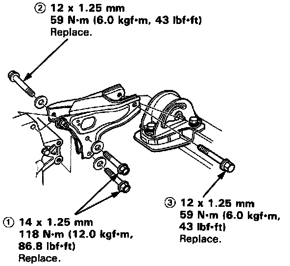 Install the engine in the reverse order of removal. Reinstall the mount bolts/nuts in the following sequence. Failure to follow these procedures may cause excessive noise and vibration, and reduce bushing life.Automatic Transaxle:
