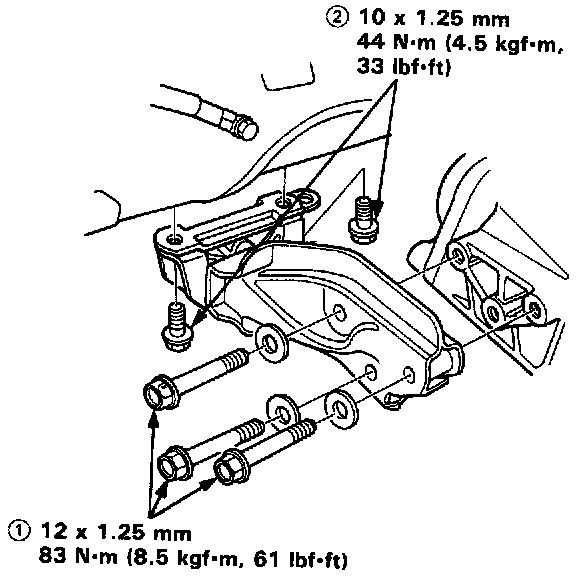 6. Install the right front mount/bracket, then tighten the bolts in the numbered sequence shown ((1) - (2)).