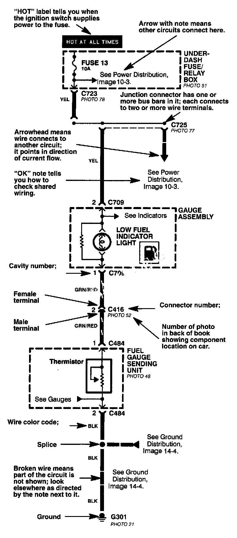 Other circuits may share power or ground terminals or wiring with the circuit shown. A wire that connects one circuit to another, for example, is cut short and has an arrowhead at the end of it pointing in the direction of current flow. Next to the arrowhead is the name of the circuit or component which shares that wiring. To quickly check shared wiring, check the operation of a component it serves. If that component works, you know the shared wiring is OK.