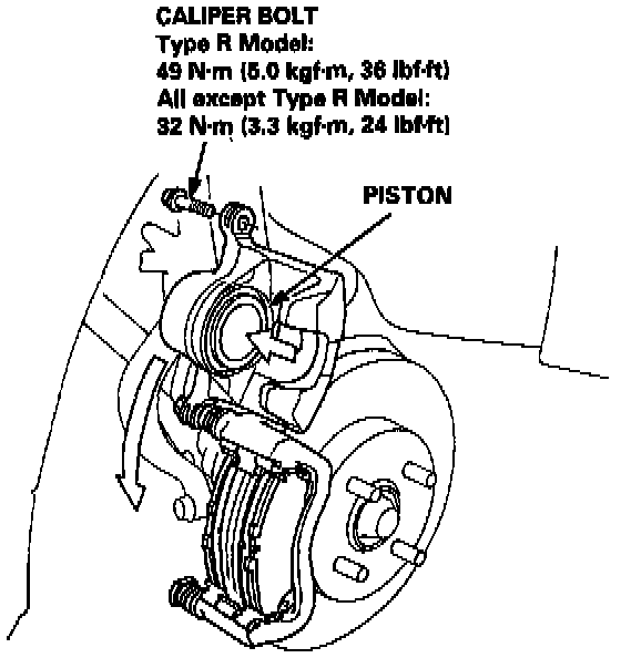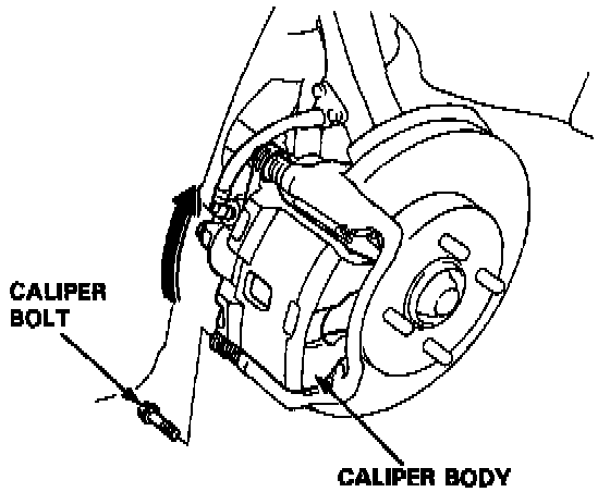 2. Remove the caliper bolt, and pivot the caliper up out of the way.