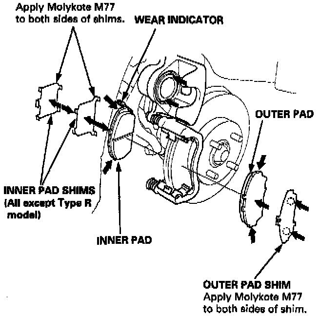 9. Apply Molykote M77 grease to both sides of the, pad shims and to the back of the pads. Wipe excess grease off the shim.