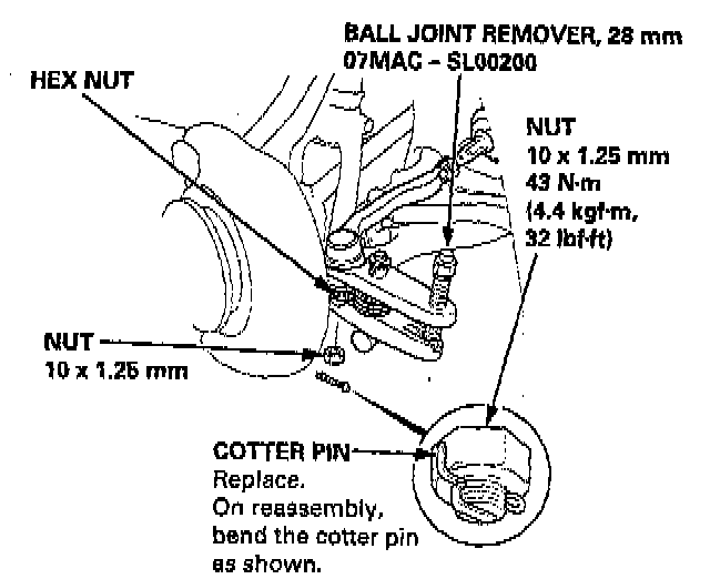 21. Install a 12 mm hex nut on the ball joint. Be sure that the hex nut is flush with the ball joint pin end, or the threaded section of the ball joint pin might be damaged by the ball joint remover.