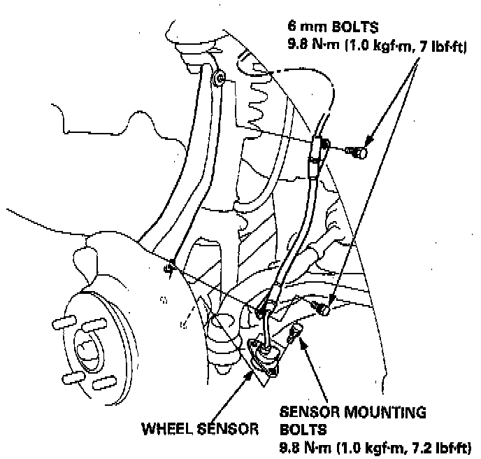 5. Install the sensor wire with the two 6 mm bolts (for vehicles with ABS).