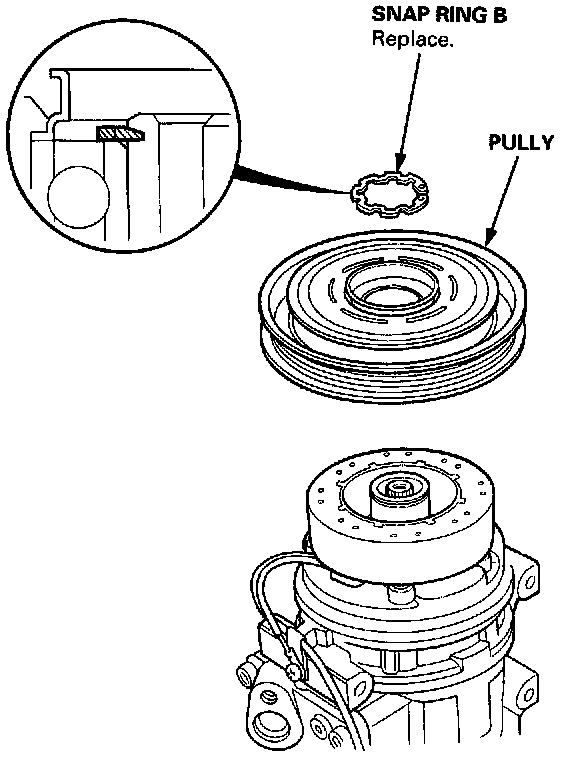 NOTE: Be careful not to damage the pulley and compressor during removal/installation. Once the snap ring B is removed, replace it with a new one.