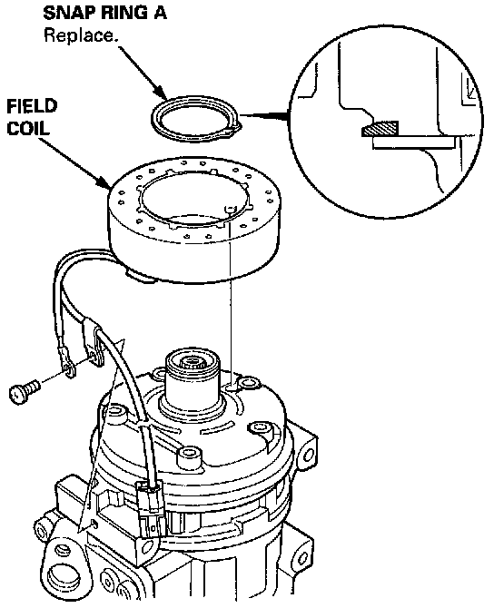 NOTE: Be careful not to damage the field coil and compressor during removal/installation. Once snap ring A is removed, replace it with a new one.