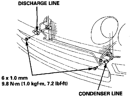 4. Remove the bolts, then disconnect the discharge line and the condenser line from the condenser.