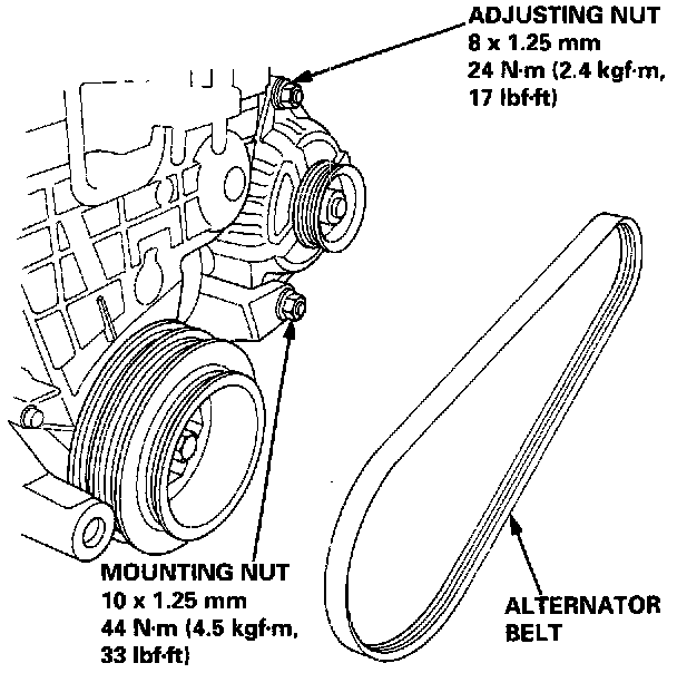 4. Loosen the adjusting nut and mounting nut, then remove the alternator belt.