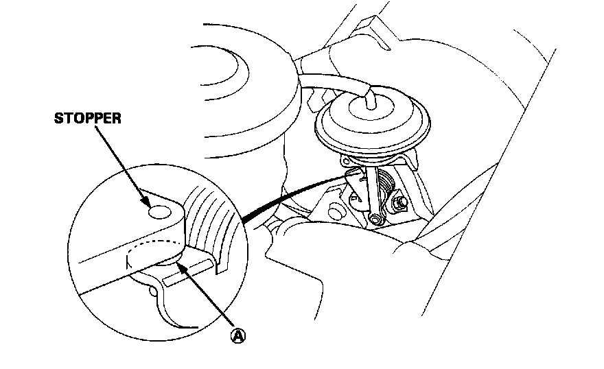 3. With the engine at idle, check that the IAB control valve (A) is in close contact with the stop when vacuum hose is disconnected.