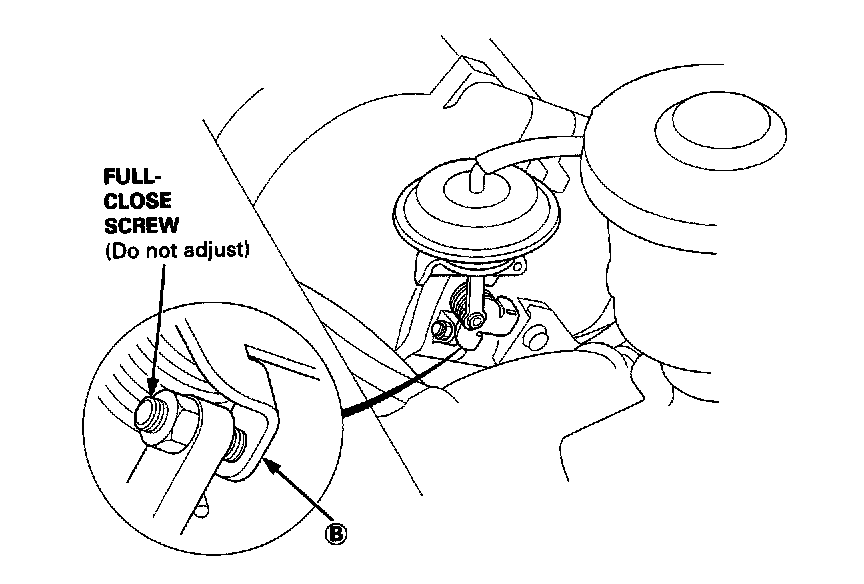 4. With the engine at idle, check that the IAB control valve (B) is in close contact with the full-close screw when the vacuum hose is connected.