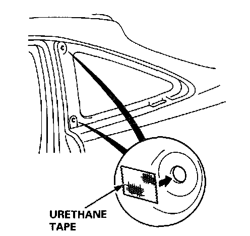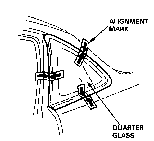 5. If the old quarter glass is to be reinstalled (and either of the clips are broken off the molding), seal the body holes with pieces of urethane tape. Set the quarter glass upright in the opening, make alignment marks across the quarter glass and body with a grease pencil at the three points shown, then remove the quarter glass.